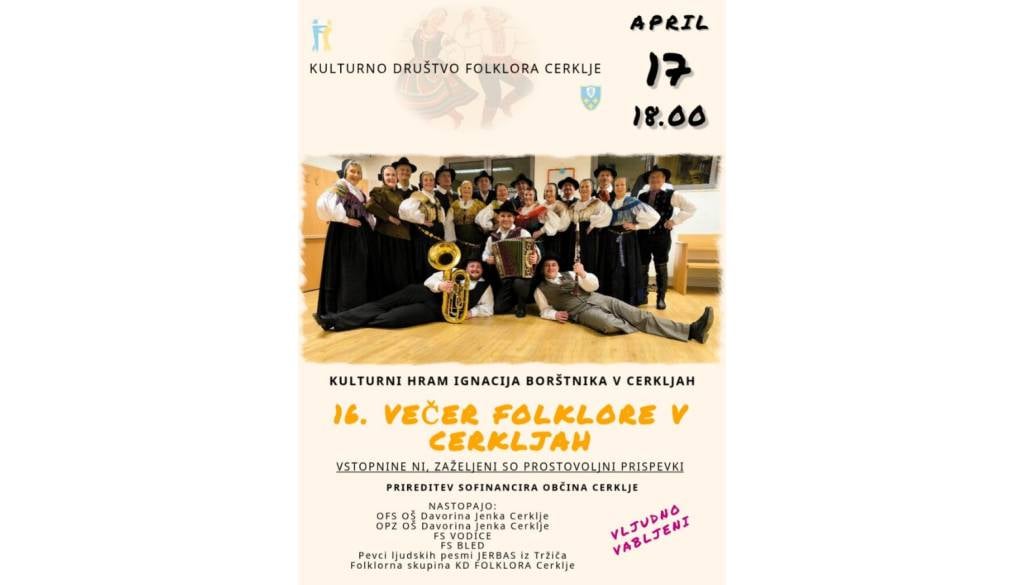 Kulturno društvo Folklora Cerklje vabi na 16. večer folklore, ki bo potekal v petek, 17. aprila 2026, ob 18. uri v Kulturnem hramu Ignacija Borštnika v Cerkljah.