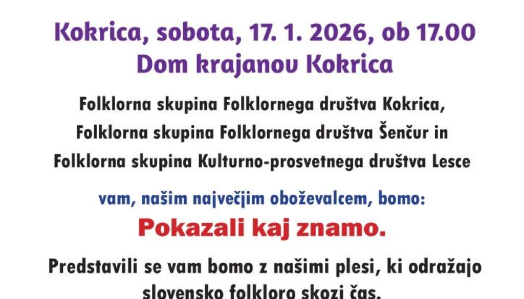 Dom krajanov KokricaFolklorno društvo Kokrica ob uspešnem zaključku 2025 pripravlja pravi FOLKLORNI VEČER NA KOKRICI. Za popestritev dogajanja in predstavitev širokega repertoarja smo povabili še dve folklorni skupini: Folklorna skupina Folklornega društva Šenčur in Folklorna skupina Kulturno-prosvetnega društva Lesce.