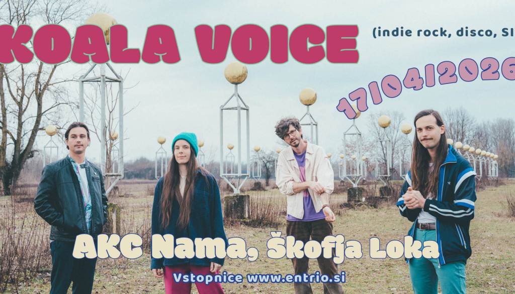 AKC Nama, Škofja LokaKoala Voice so lani obeležili petnajsto obletnico delovanja in deseto obletnico izdaje prvenca Kangaroo's a neighbour, svoj koncertni pohod pa nadaljujejo tudi v letu 2026. koncertni pohod. Na odru nam bodo predstavili mešanico vseh petih studijskih albumov vključno z zadnjim petim imenovanim - Auf Wiedersehen, s katerega prepoznamo Sonce Pomaranča, Vest, Tebe Imam Rajši Od Drugih,The Bigger The City in Late For The Party. Ob spremljavi njihove žmohtne odrske prezence in nalezljivih kitarskih riffov pa lahko poleg že utečenih komadov iz prejšnjih albumov kot so Go disco go, Wild dance, Sierra, Vede Premikanja, Ker tu je vse tako lepo, Vertigo, Spaghettification in Vukovi, pričakujete tudi nove komade v žanrski mešanici indie-rocka, punk-popa in disca.