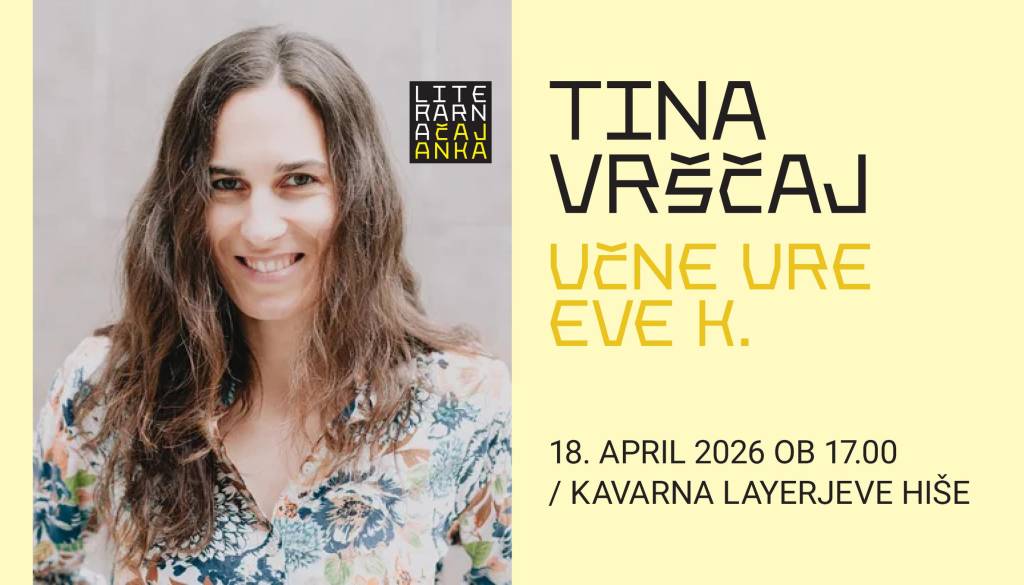 Layerjeva hišaNa Literarni čajanki se nam bo pridružila Tina Vrščaj, avtorica letošnjega maturitetnega romana Na Klancu, ki je pri založbi Beletrina lani izdala njegovo nadaljevanje – Učne ure Eve K., nekakšno »črno knjigo« o šoli.