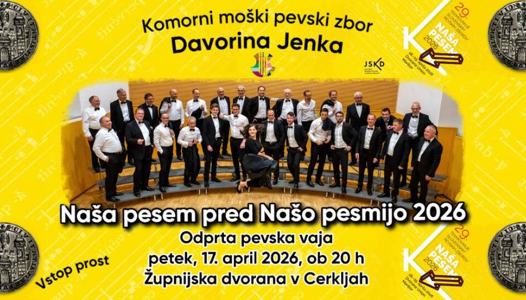 Župnijska dvorana Jožefa Kvasa, Trg Davorina Jenka 14, 4207 Cerklje na GorenjskemKomorni moški pevski zbor Davorina Jenka Cerklje vas vabi, da se nam pridružite na odprti pevski vaji – generalki pred državnim pevskim tekmovanjem Naša pesem 2026 v Mariboru, ki nas v tamkajšnji Dvorani Union čaka v nedeljo, 19. aprila 2026, ob 17.30.