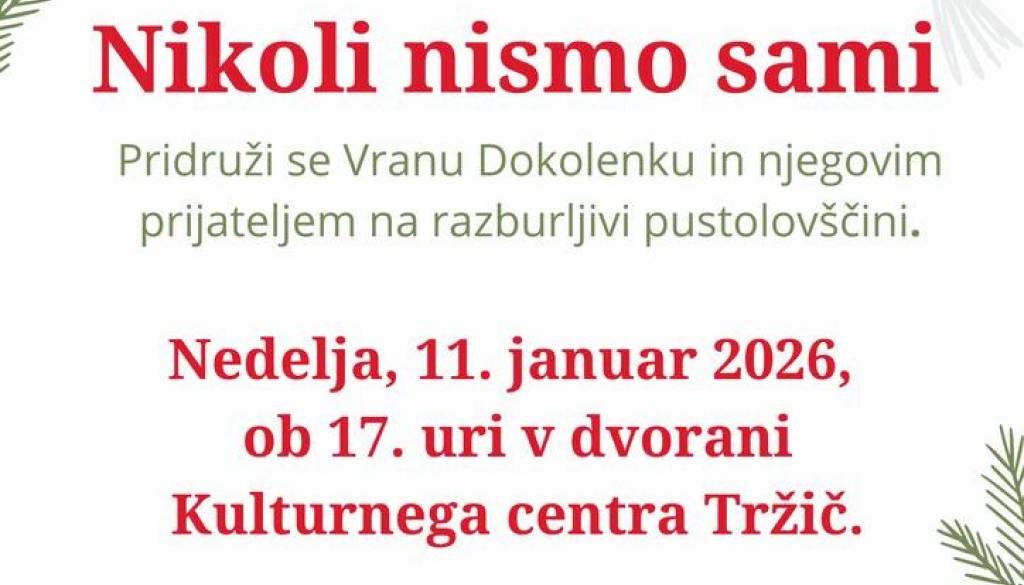Nikoli nismo sami - gledališka predstava za otroke gregor1 | 6. januar 2026 13:38 v Za otroke Termin Nedelja, 11. januar 2026 17:00 Lokacija Kulturni center Tržič Nikoli nismo sami - gledališka predstava za otroke