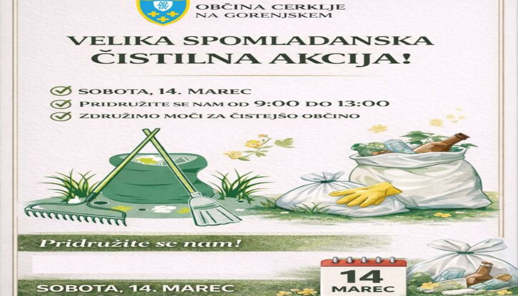 Občina Cerklje na Gorenjskem v soboto, 14. marca 2026, organizira tradicionalno spomladansko čistilno akcijo, katere namen je odstraniti čim več v naravi odloženih odpadkov ter prispevati k urejenemu in zdravemu okolju za vse prebivalce.