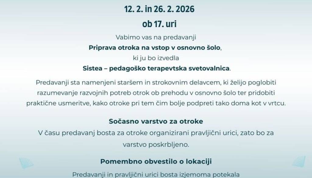 Predavanji bosta trajali 45–60 minut. Cilj predavanj je staršem ponuditi jasne in zanesljive informacije o vpisu v šolo, zmanjšati negotovost ter predstaviti konkretne smernice za podporo otroku v zadnjem letu vrtca.