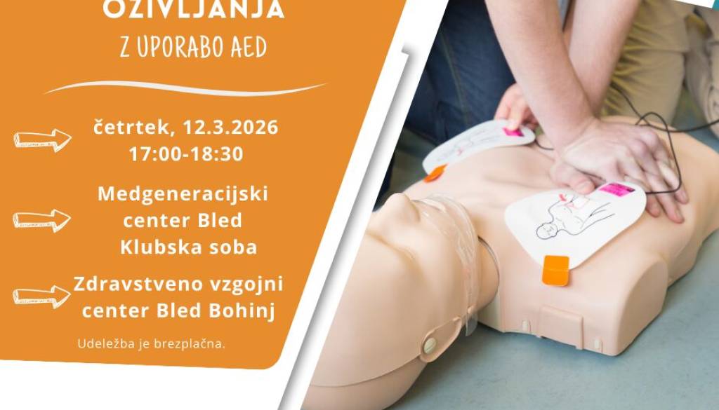 Medgeneracijski center Vezenine BledV četrtek, 12.3.2026 bo v Medgeneracijskem centru Bled (Klubska soba) od 17:00 do 18:30 potekala delavnica Temeljni postopki oživljanja z uporabo AED v sodelovanju z Zdravstveno vzgojnim centrom Bled Bohinj.