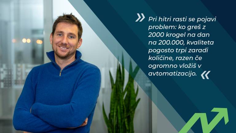 Pri hitri rasti se pojavi problem: ko greš z 2000 krogel na dan na 200.000, kvaliteta pogosto trpi zaradi količine, razen če ogromno vložiš v avtomatizacijo. Najprej moraš narediti 'scale-up', da prideš do denarja, potem pa ta denar vložiš, da izboljšaš kakovost in nadoknadiš, kar je trpelo. To je stalni proces: korak naprej, nato popravek, potem spet naprej.«