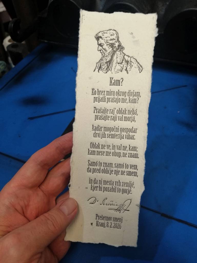 »Prostor smo ustvarili z namenom, da obiskovalce prestavi za dvesto let v preteklost, da se pokaže, kako se je tako živelo in delalo. Slovenci smo lahko ponosni, da smo Slovenci. Na steni so prijatelji iz tistega časa Trubar, Čop, Smole, Julija ter ljubljanski tiskar Blaznik, ki je prvi natisnil in izdal Poezije, leta 1847. 8. februar je lep praznik, a moje mnenje je, da smo lahko kulturni vse dni v letu,« nam je razložil prešerni gostitelj.