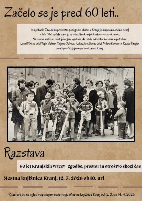 Mestna občina Kranj vabi na odprtje razstave ob 60. obletnici Kranjskih vrtcev. Dogodek bo v četrtek, 12. marca 2026, ob 10. uri v Mestni knjižnici Kranj.