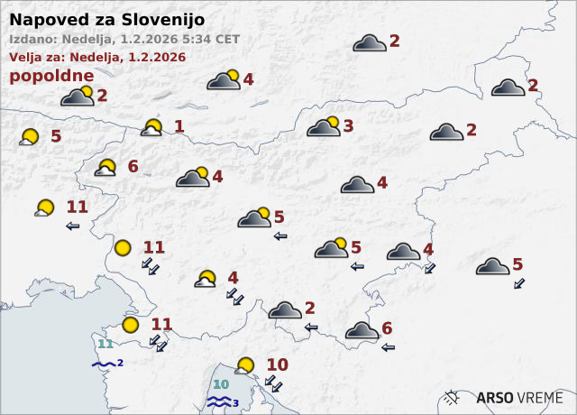 Jutri se bo v notranjosti Slovenije nadaljevalo večinoma oblačno vreme, popoldne pa se bo oblačnost predvsem v severovzhodnih krajih začela trgati. Na Primorskem bo do večera večinoma jasno, nato se bo od zahoda pooblačilo. Najnižje jutranje temperature bodo od -4 do 1, najvišje dnevne od 1 do 5, na Goriškem in v Slovenski Istri do 10 stopinj Celzija..