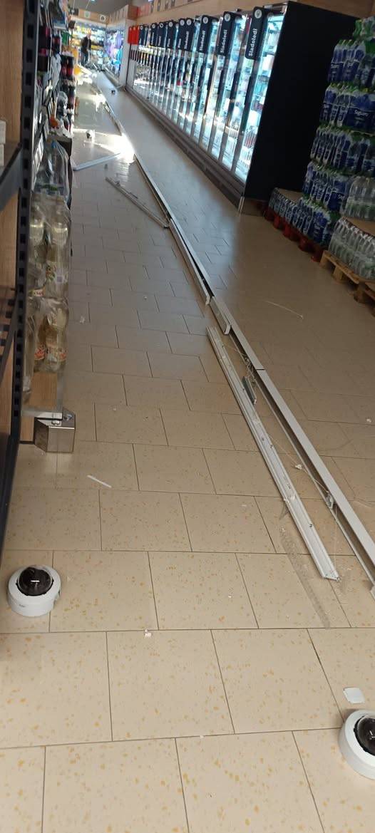 Po njenem zapisu je v trgovini s stropa odpadla celotna instalacija svetil nad prodajnimi policami. Ob tem poudarja, da v tistem trenutku na tem mestu ni bilo ne kupcev ne zaposlenih, zato naj bi se incident končal brez poškodb.