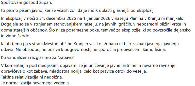 Oglasila se je zaradi dogajanja v kranjskem naselju Planina v noči z 31. decembra 2025 na 1. januar 2026, ko je po njenih besedah prišlo do množičnih pirotehničnih eksplozij in posledičnih poškodb javnih površin.