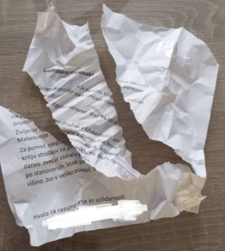 »Prosimo ljudi brez empatije in brez sočutja, da ne trgajo obvestil na oglasnih deskah in jih ne mečejo v koš za smeti. Ja, preminuli je iz Makedonije, kar je nekoga očitno zmotilo, a lahko bi to bil kdorkoli. Vsi smo ranljivi, bodimo sočutni. Jeseničani pa znamo biti solidarni.«