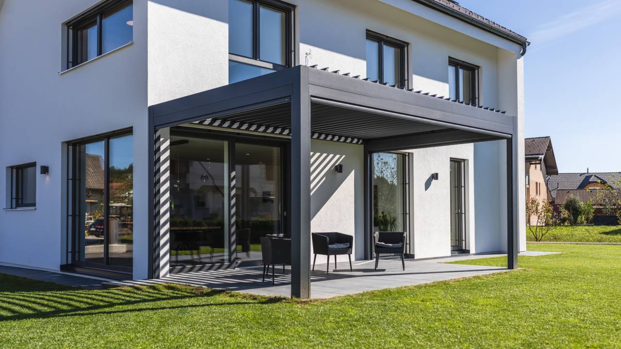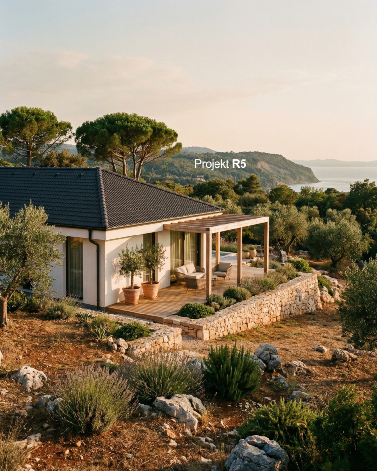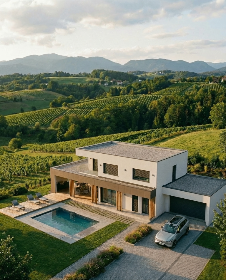 - Brezčasen, trajnostni dizajn – minimalistična arhitektura z jasnimi linijami in umirjeno barvno paleto se naravno povezuje z okolico; funkcionalno zasnovan napušč zagotavlja senčenje in udobje na terasi.