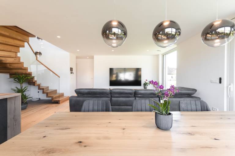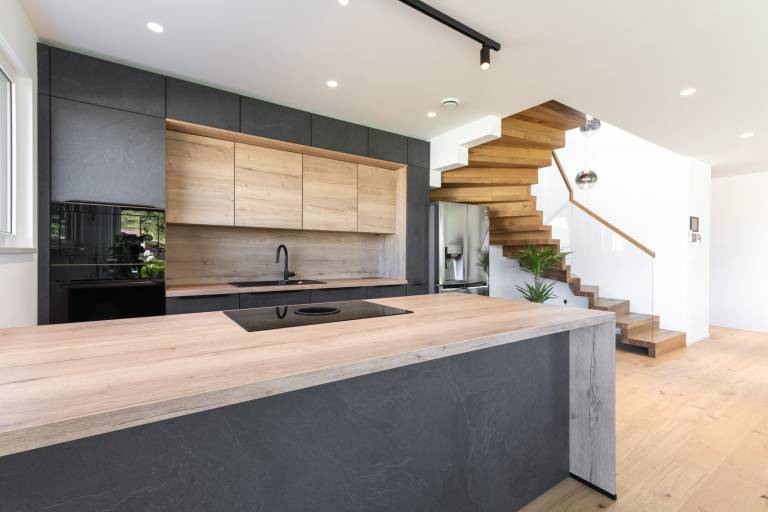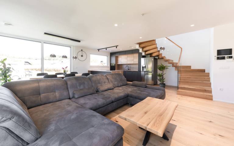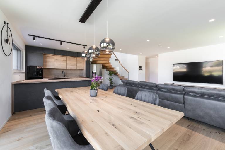 - Odprt in funkcionalen bivalni prostor – svetlo pritličje z odprtim tlorisom povezuje kuhinjo, jedilnico in dnevni prostor v zračno, uporabno celoto za sodobno družinsko bivanje.