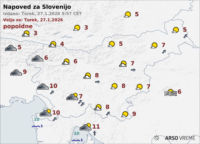 Najvišje dnevne temperature bodo od tri do devet, na Primorskem okoli deset stopinj Celzija.
