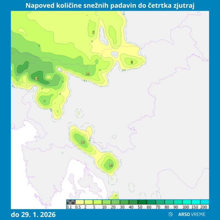 V četrtek bodo predvsem na zahodu in severu občasne krajevne padavine, meja sneženja bo predvidoma med 500 in 800 metrov nad morjem.
