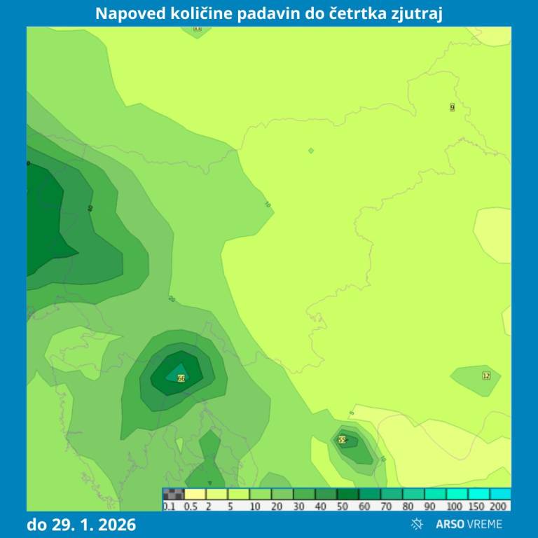 Do četrtkovega jutra lahko pričakujemo v zahodni Sloveniji od 20 do 40 milimetrov padavin, v osrednji Sloveniji od deset do 20 in na vzhodu večinoma od pet do deset milimetrov.