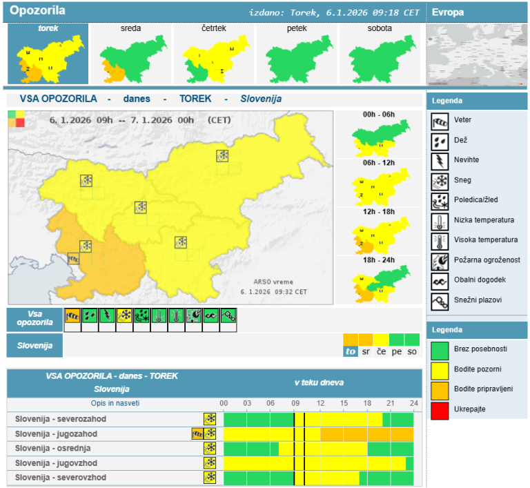 Sneženje bo zvečer od severozahoda postopno slabelo in ponoči marsikje ponehalo. Izjema bosta jug in jugovzhod države, kjer bo občasno snežilo še do jutrišnjega dopoldneva.