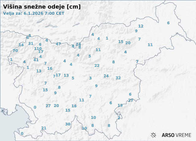 V severni in osrednji Sloveniji bo predvidoma zapadlo od pet do 20 centimetrov snega, najmanj pa v zahodnem delu Gorenjske, Posočju in nižinah Primorske, kjer bo snega do pet centimetrov.