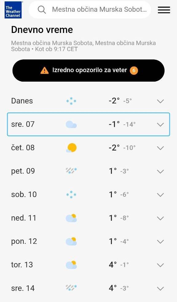 The Weather Channel navaja, da se bodo temperature v Murski Soboti jutri spustile vse do minus 14 stopinj Celzija.