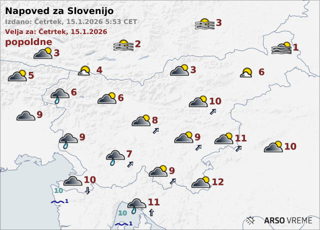 Jutri ne bo večje spremembe vremena. Najnižje jutranje temperature bodo v severnih krajih od minus pet do nič, drugod v notranjosti od ena do štiri, na Primorskem od pet do osem, najvišje dnevne na severu od ena do pet, drugod pa od šest do 12 stopinj Celzija.