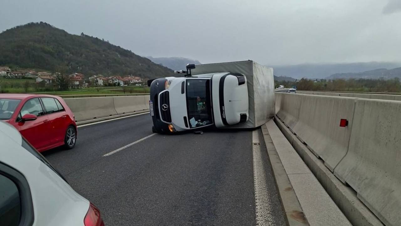 Na hitri cesti med Podnanosom in Vrtojbo je burja prevrnila tovornjak.