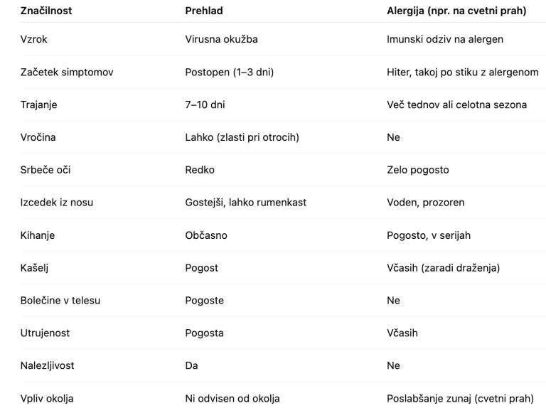 Razlika pa je pomembna, saj prehlad povzroči virusna okužba, alergija pa je odziv imunskega sistema na alergen, najpogosteje cvetni prah.