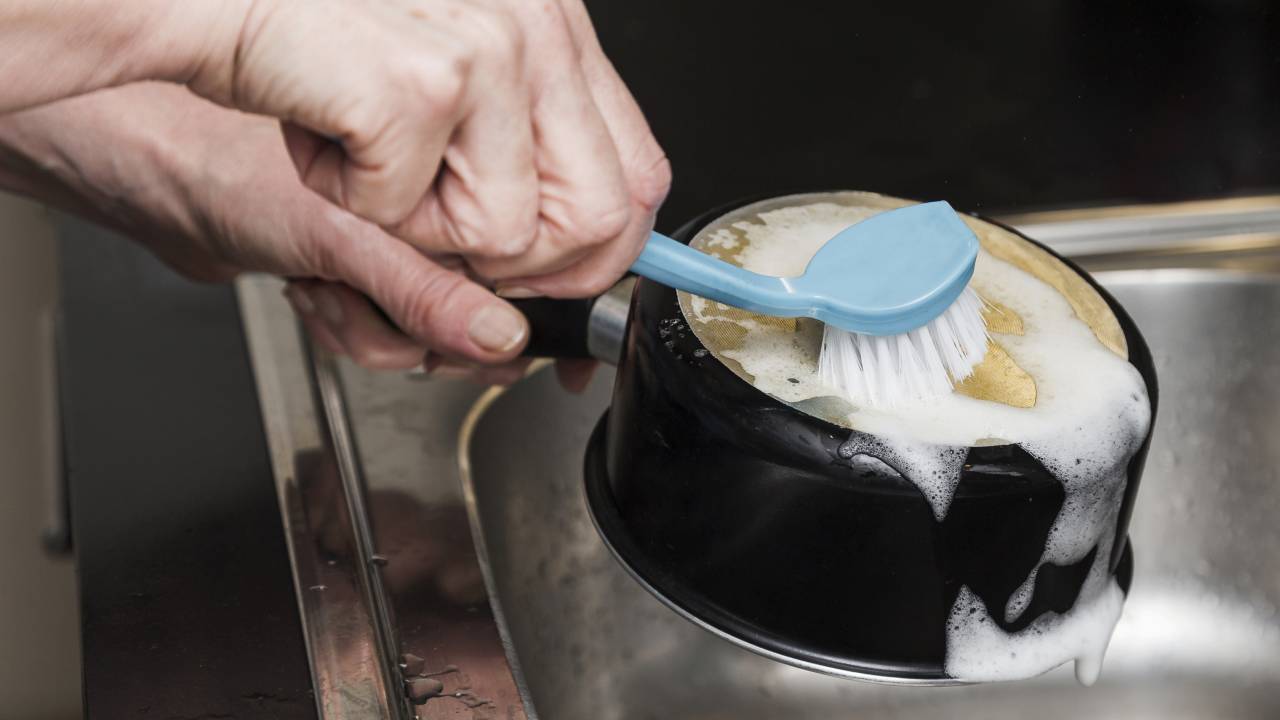 Kot pojasnjuje, visoka temperatura zmehča zasušene ostanke, kislina razgradi maščobo, soda pa pomaga odstraniti trdovratne obloge. Po tem posodo očistimo z mehko gobo.
