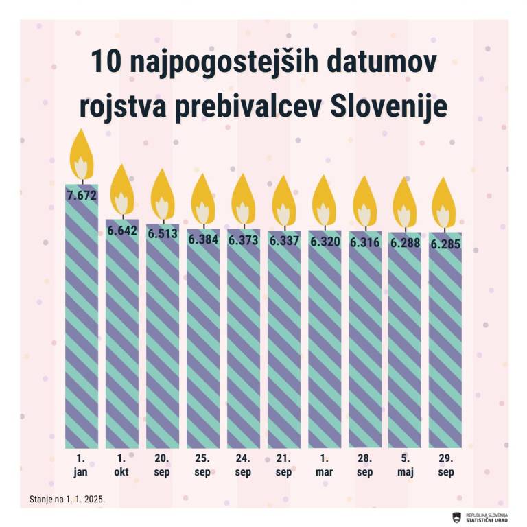 Po podatkih Statističnega urada Slovenije ima največ prebivalcev rojstni dan 1. januarja. Na ta dan je bilo po stanju na 1. 1. 2025 rojenih 7672 prebivalcev Slovenije. Na drugem mestu je 1. oktober s 6642 rojstvi.